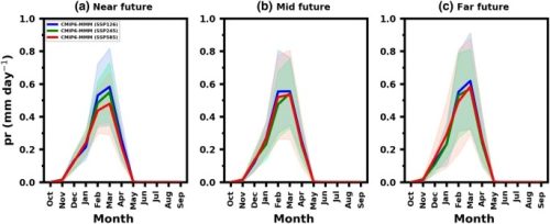 استخدام الباحثون مجموعة من ثلاثين محاكاة إحصائية ومصححة متحيزة وعالية الدقة لبيانات هطول الأمطار من مشروع NEX-GDDP لتقييم المناخ المستقبلي، ومجموعات البيانات هذه مستمدة من الجيل الجديد من أحدث عمليات محاكاة GCM التي تم إجراؤها في إطار المرحلة السادسة من مشروع المقارنة بين النماذج المزدوجة (CMIP6)، وتم تصميم هذه المسارات لتحقيق تركيز ثابت لثاني أكسيد الكربون والاستجابة للتأثير الإشعاعي على مدار القرن القادم.