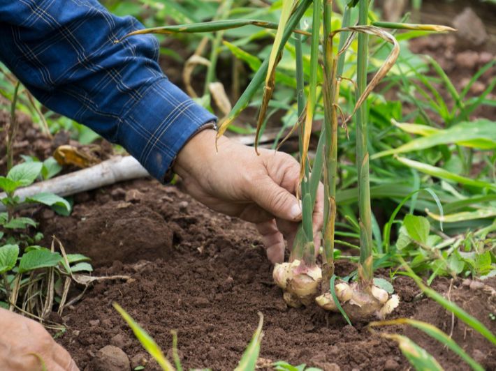 - يمكن حفر الزنجبيل بحذر باستخدام مجرفة أو يدوية، ثم يتم فصل الجذور عن التربة.