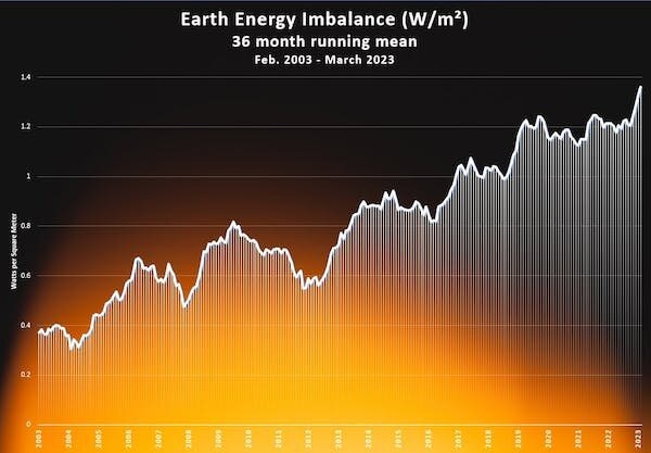 يبلغ متوسط تشغيل عدم توازن طاقة الأرض على مدى 36 شهرًا الآن مستوى قياسيًا يبلغ 1.36 واط لكل متر مربع.