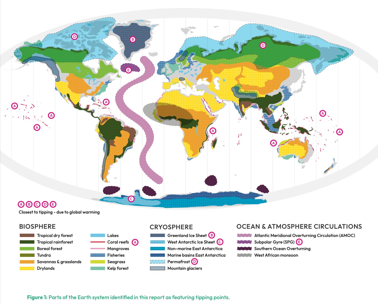عالم 3 درجات غير صالح للعيش، يتم أيضًا الكشف عن أدلة على نقاط التحول المناخية عبر نظام الأرض بالإضافة إلى انهيارها ، مع عواقب متتالية على بعضها البعض.