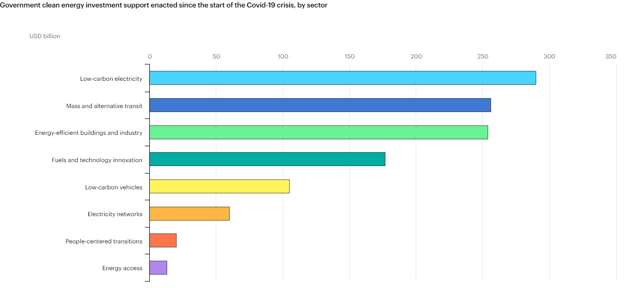 وفقًا لتقارير وكالة الطاقة الدولية “الحصة الأكبر من دعم الاستثمار في الطاقة النظيفة تتجه الآن إلى الكهرباء منخفضة الكربون (290 مليار دولار) ، تليها النقل الجماعي والبديل (256 مليار دولار، نصفها تقريبًا يذهب إلى السكك الحديدية عالية السرعة).