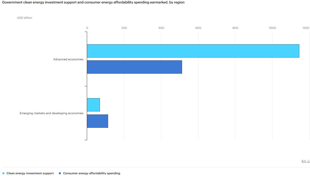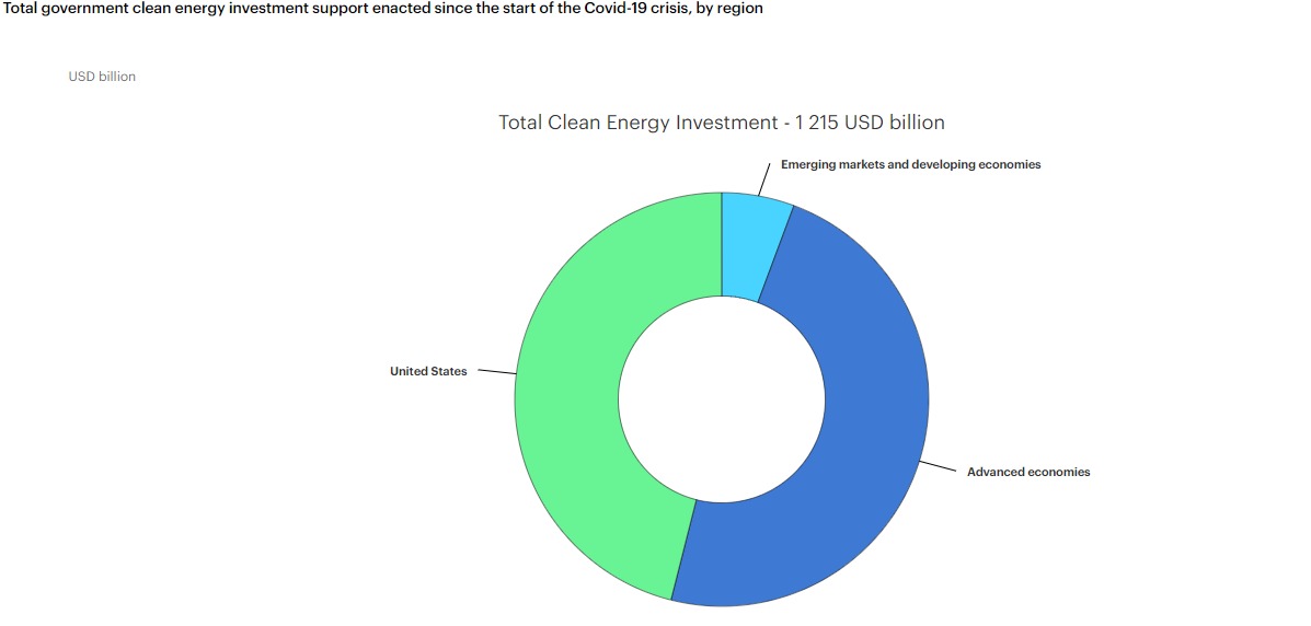 تقريبًا كل الدعم الحكومي للاستثمار في الطاقة النظيفة (95٪) منذ أزمة فيروس كورونا كان في الاقتصادات المتقدمة، وفقًا لوكالة الطاقة الدولية، التي خصصت مجتمعة 1145 مليار دولار. تمثل أمريكا حوالي نصف هذا، حيث يوجه قاون التضخم الأمريكي، وحده 370 مليار دولار ، بينما يأتي 37 ٪ (حوالي 45 مليار دولار) من استثمارات الاتحاد الأوروبي.