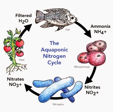 ومعنى وجود البكتيريا أن هذا النظام يعتمد على حدوث عملية فلتره حيوية (Nitrification) تحويل الأمونيا إلى نيتريت بواسطة بكتريا Nitrosamona bacteria ثم يتم تحويل النيتريت الى نترات بواسطة بكتريا Nitrobacter bacteria والنترات هى أقل الصور ضررا على الأسماك وتنشط البكتيريا في نظام الزراعة بأكمله ويعتبر فلتر حيوي حيث تنشط البكتيريا في جميع أجزاء النظام وتقوم جذور النباتات بامتصاص جميع العناصر الذائبة في المياه من نيتروجين في صورة نترات – بوتاسيوم – كالسيوم – فسفور – ماغنسيوم الناتجة من عملية التمثيل الغذائي للأسماك حيث أن الغذاء المقدم يومياً للأسماك يحتوى على جميع هذه العناصر . وبالتالي يحصل النبات على احتياجاته من العناصر الغذائية اللازمة للنمو والانتاج.