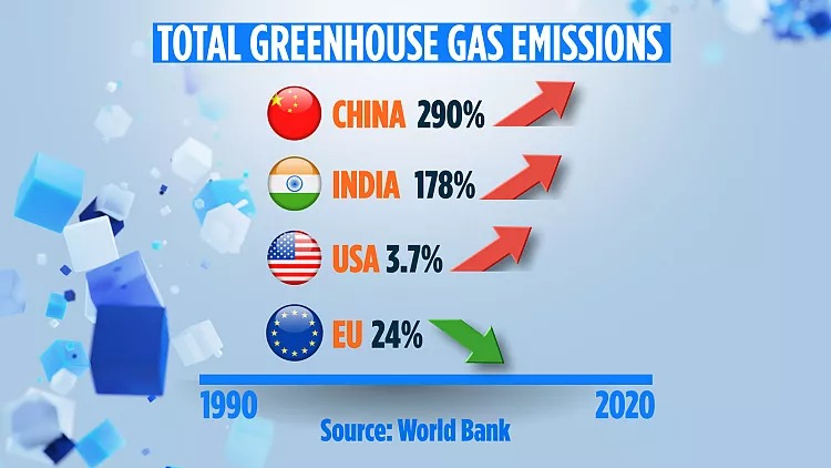 من ناحية أخرى، شهدت الصين زيادة في انبعاثاتها بنحو 300٪ خلال نفس الفترة الزمنية. شهدت الهند ارتفاعًا بنسبة 178٪ في انبعاثاتها.