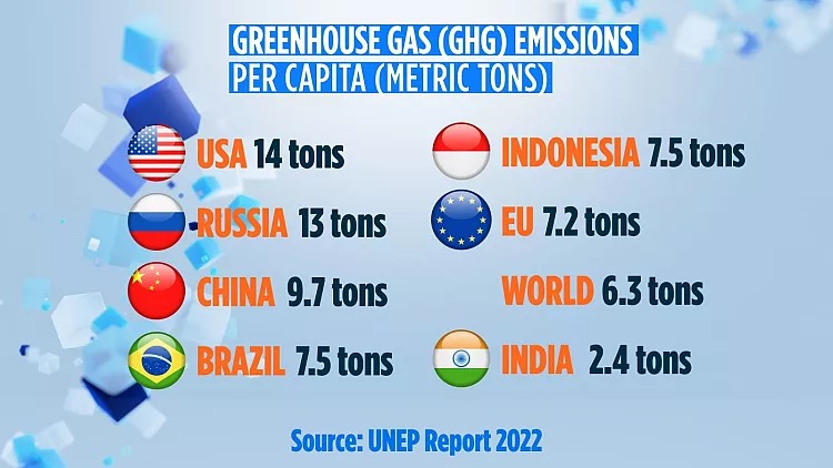 وفقًا لتقرير للأمم المتحدة نُشر في عام 2022، فإن الولايات المتحدة هي أكبر مصدر لانبعاثات غازات الدفيئة بأكثر من 14 طنًا من ثاني أكسيد الكربون للفرد ، تليها روسيا بـ 13 طنًا من ثاني أكسيد الكربون للفرد، ثم الصين بـ 9.7 طن.
