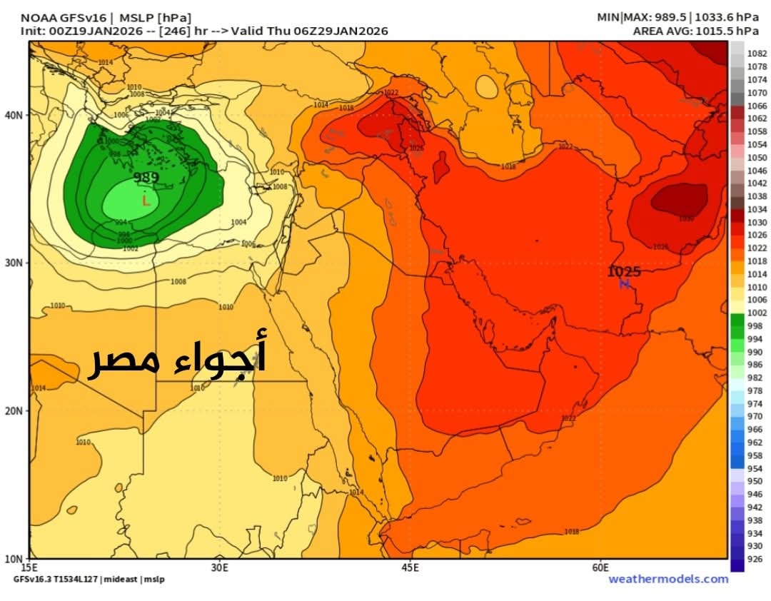 النموذج الأمريكي: يشير إلى منخفض جوي متعمق داخل الأراضي الليبية ووصوله إلى أقصى غرب مصر، مع منخفض سطحي عميق شمال شرق ليبيا حتى السلوم وسيدي براني، بقيم ضغط تصل إلى 989 ملليبار، مصحوب برياح قوية قد تتجاوز 110 كم/س شمال غرب البلاد. عند تقدمه شرقًا، تتراجع قوته تدريجيًا مع فرص أمطار شمالًا.