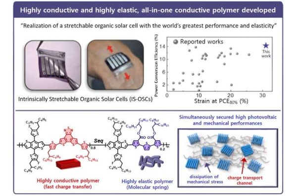 في 26 ديسمبر، أعلن فريق بحث KAIST من قسم الهندسة الكيميائية والبيولوجية الجزيئية (CBE) بقيادة البروفيسور بومجون كيم عن تطوير مادة بوليمر موصلة جديدة حققت أداءً كهربائيًا عاليًا ومرونة مع تقديم أعلى أداء عضوي قابل للتمدد في العالم. الخلايا الشمسية.