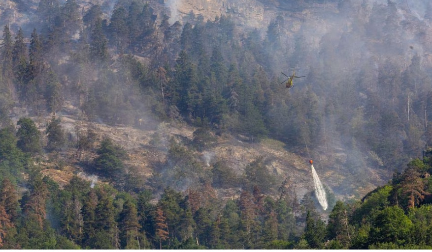 اندلع الحريق يوم الاثنين على جانب جبل فى بيتش فى كانتون فاليه بالقرب من الحدود الإيطالية، وحلقت طائرات الهليكوبتر في سماء المنطقة طوال الليل لإلقاء المياه على النيران.