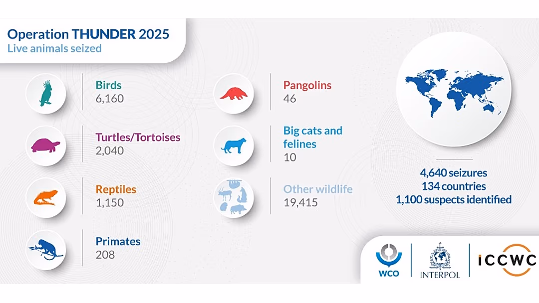 عرفت العملية باسم “عملية الرعد”، ونُسقت بواسطة الإنتربول ومنظمة الجمارك العالمية، وأسفرت بين 15 سبتمبر و15 أكتوبر عن تسجيل 4,460 مصادرة قياسية تشمل عشرات الآلاف من الحيوانات والنباتات المحمية وأطنان من الأخشاب المقطوعة بشكل غير قانوني، إضافة إلى أكثر من 30 طنًا من الأنواع المهددة بالانقراض، مع تحديد 1,100 مشتبه به.