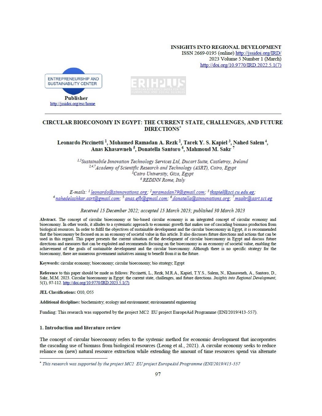 Piccinetti, L.; Rezk, M. R.; Kapiel, T. Y.; Salem, N.; Khasawneh, A.; Santoro, D.; Sakr, M. M. 2023. Circular bioeconomy in Egypt: the current state, challenges, and future directions, Insights into Regional Development 5(1): 97-112. https://doi.org/10.9770/IRD.2023.5.1(7)