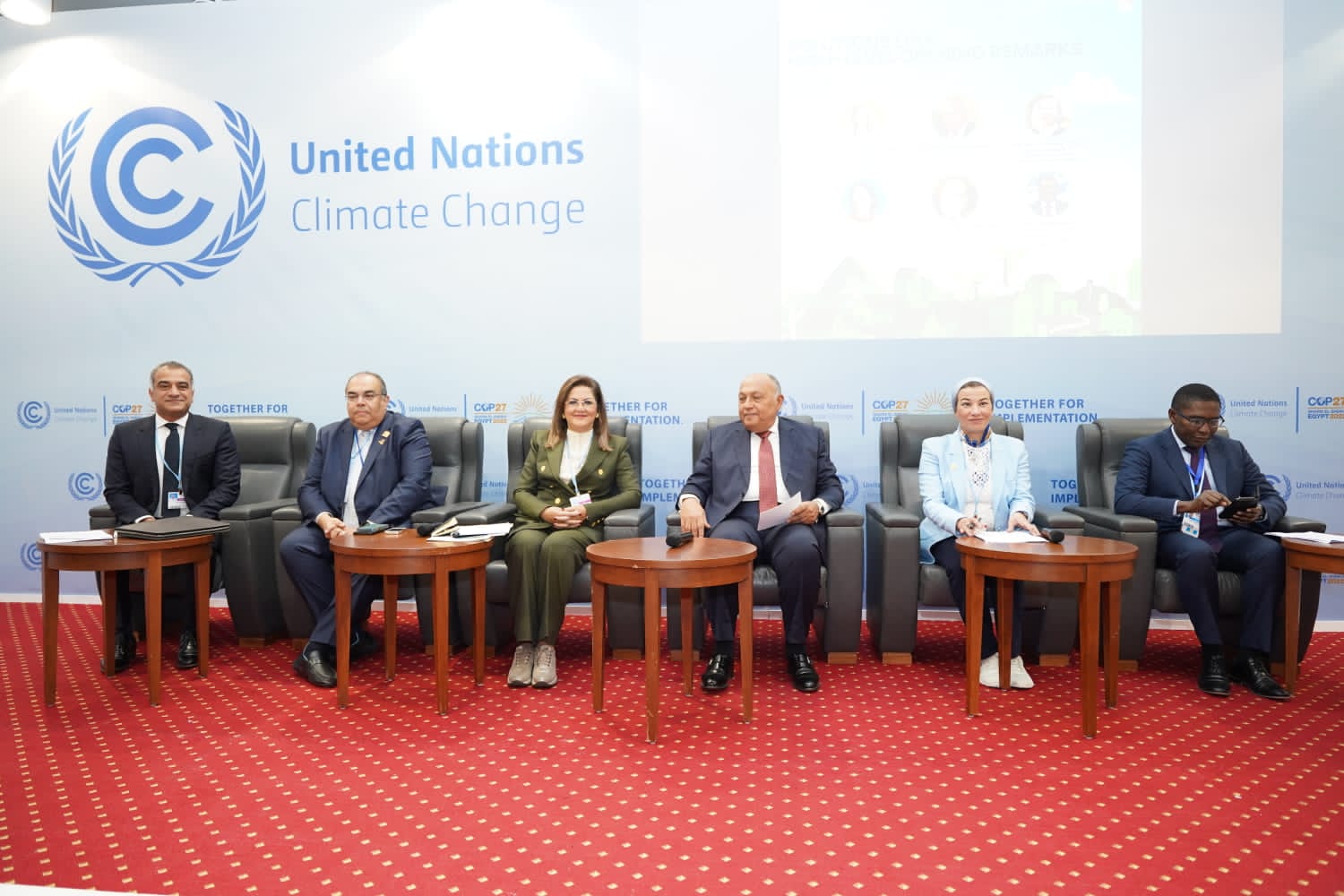 الوزير شكري أكد على ما يوفره هذا اليوم من فرصة هامة لتبادل الآراء والخبرات بهدف إيجاد حلول جديدة ومبتكرة وشاملة لأزمة المناخ التي يشهدها العالم اليوم، موضحاً أن تخصيص الرئاسة المصرية للمؤتمر ليوم خاص بالحلول المناخية يأتي اتساقاً مع قضية تنفيذ تعهدات المناخ التي اختارتها كموضوع رئيسي للمؤتمر.