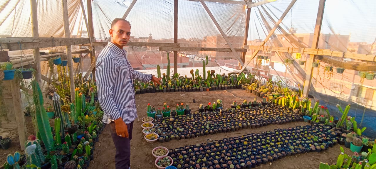 محمد عاطف من سكان شبين القناطر يحكي لـ ” المستقبل الأخضر ” عن بداياته مع نبات الصبار وكيف استطاع هذا الشاب أن يحول سطح منزله الى حديقة مليئة بمختلف أنواع الصباريات النادرة التي تتميز بألوانها الجذابة كانت البداية عندما قام محمد بزيارة لإحدى المعارض بالمتحف الزراعي بمنطقة الدقي منذ سنوات أخذ يتفقد المعارض حتي تمكن من شراء 4 أنواع من الصباريات منها المطعوم الشيء الذي لفت انتباهه وأخذ يسأل نفسه كيف تم هذه التطعيم وبالفعل بحث محمد مستخدماً اليوتيوب في فهم عملية التطعيم حتي توصل الى الطريقة وأخذ يطبقها تدريجيا على أنواع من الصباريات حتي أصبح متمكناً وبدلاً من 4 أنواع أصبح لديه العديد من الصباريات من خلال فكرة الإكثار وتحولت الفكرة الى انتاج وبيع المنتج وتحقيق أرباح مرضية.
