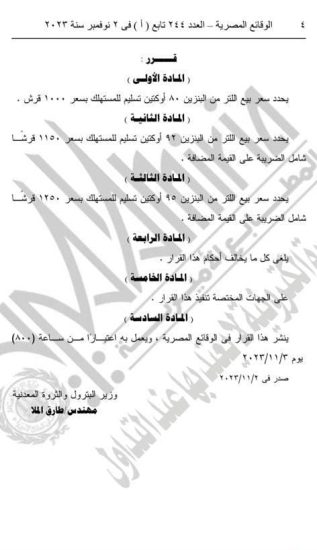 نشرت الجريدة الرسمية، قرار المهندس طارق الملا وزير البترول والثروة المعدنية، بتعديل أسعار المواد البترولية، وشملت زيادة سعر بنزين 80 أوكتين إلى 10 جنيهات، وزيادة سعر بنزين 92 أوكتين، إلى 11.50 جنيها شامل الضريبة على القمية المضافة.