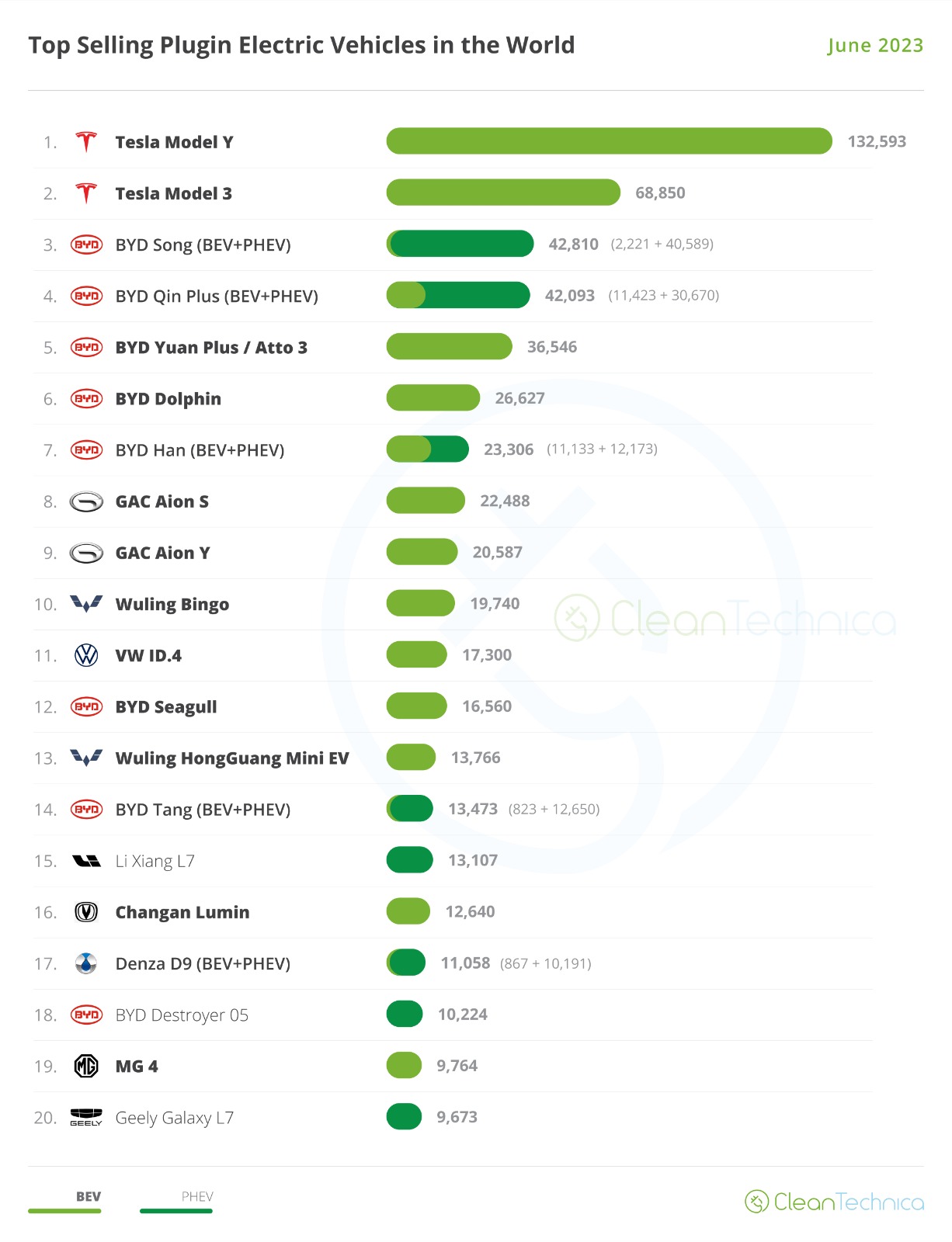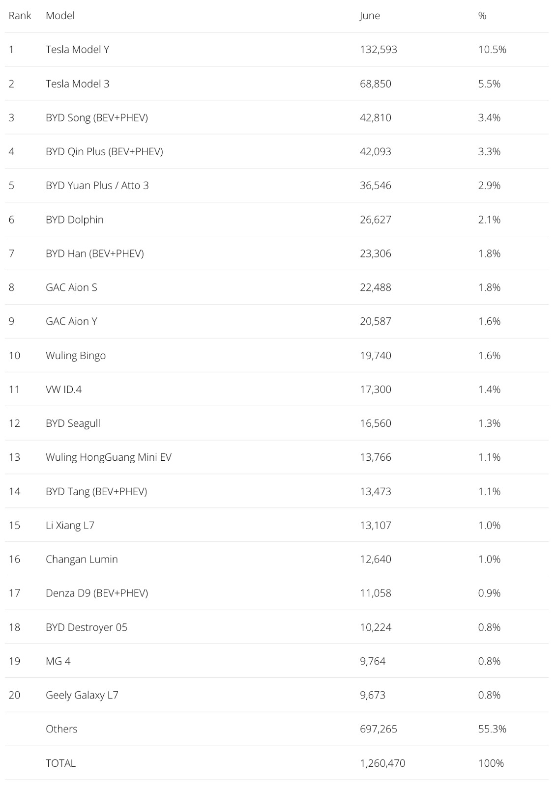بالنظر إلى أكثر الكتب مبيعًا لشهر يونيو، لم تكن هناك مفاجآت على المنصة. كان Tesla Model Y مرتفعًا فوق أي شخص آخر ، بينما خلفه ، فاز طراز Tesla Model 3 بالسباق على BYD Song و Qin Plus ، مستفيدًا من ذروة شهر تسلا في نهاية الربع.