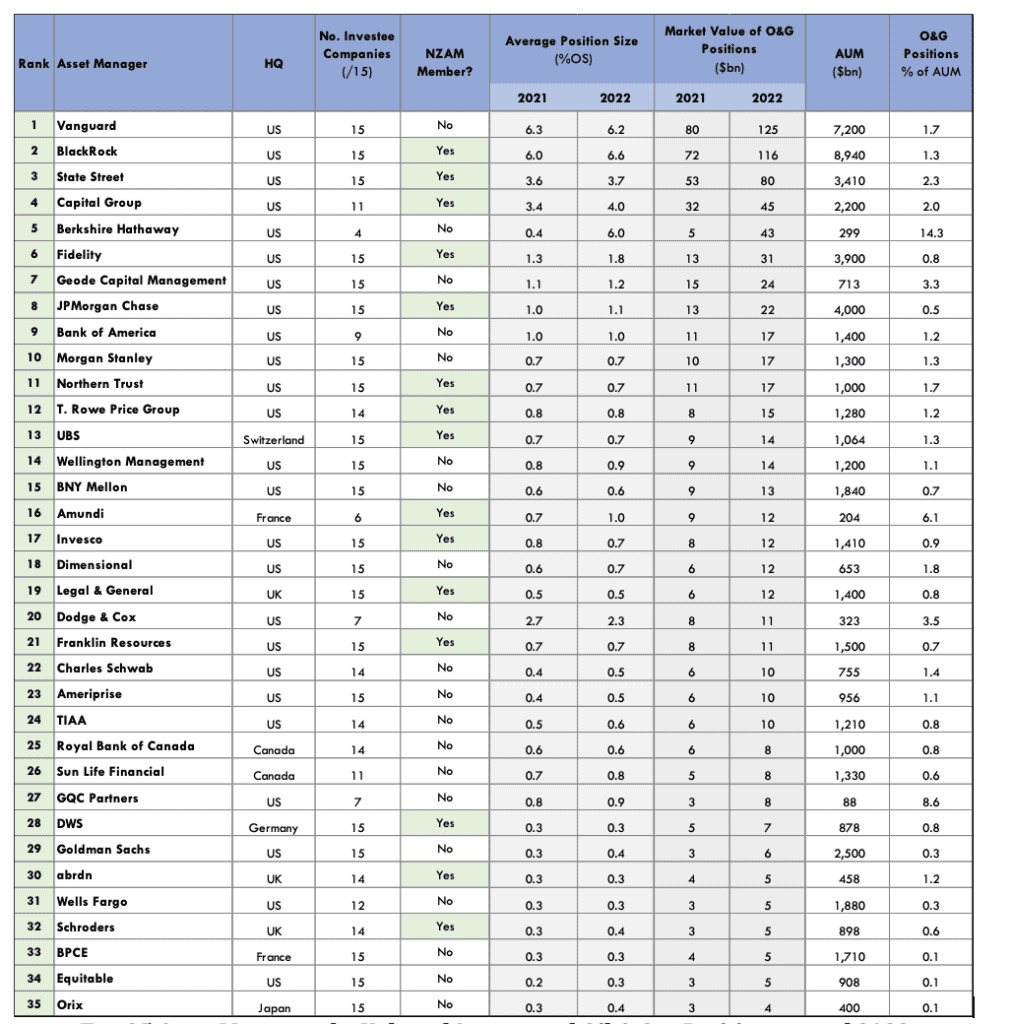 حدد موقع Carbon Tracker أكبر 20 مساهمًا في كل شركة من شركات النفط والغاز الخمسة عشر الكبرى، وكان من بينهم 90 من مديري الأصول، 25 منهم أعضاء في NZAM، ثم قام بتحليل منصب كل مدير أصول عبر كل شركة