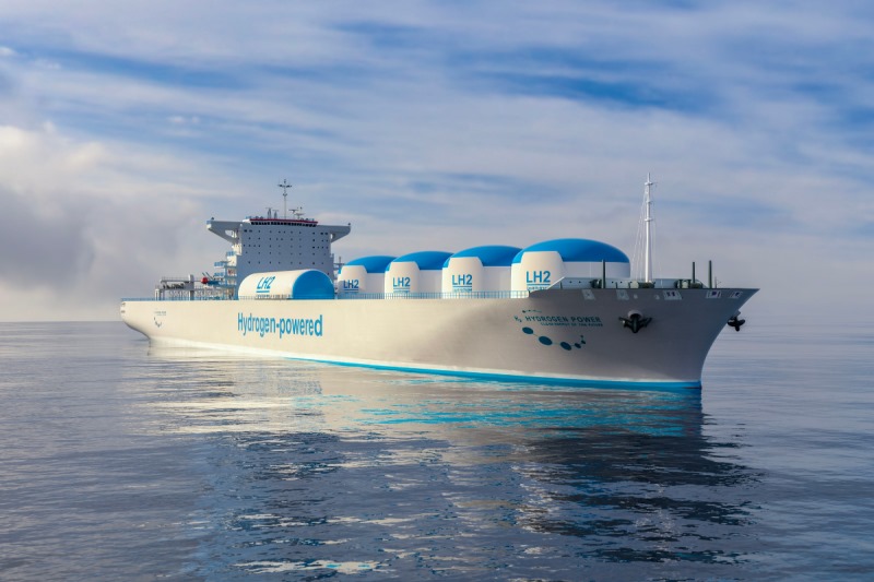 تعمل هذه العملية على تقسيم الماء إلى غازي الهيدروجين والأكسجين، يتم بعد ذلك معالجة الهيدروجين وضغطه وتخزينه على متن السفينة في صورة سائلة.