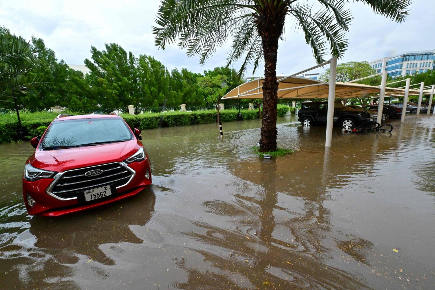 وأصبحت سماء دبي التي تكون عادة زرقاء وصافية، رمادية وحجبت السحب نور الشمس حتى باتت الأجواء مظلمة في فترة بعد الظهر.