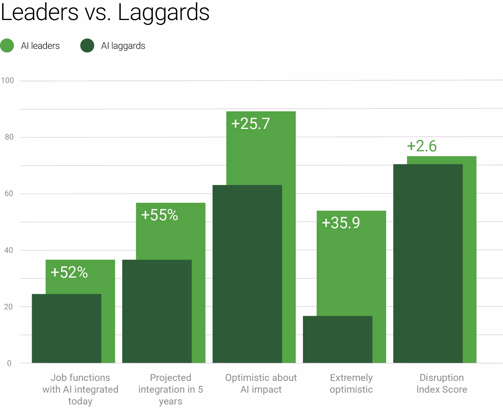 هم أكثر تفاؤلًا بشأن تأثير الذكاء الاصطناعي (89٪ مقابل 64٪) ويتوقعون مستويات أعلى من التكامل خلال السنوات الخمس المقبلة.